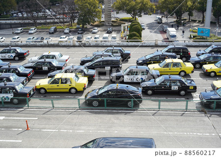 JR駅前のタクシー乗り場に並ぶタクシーの列