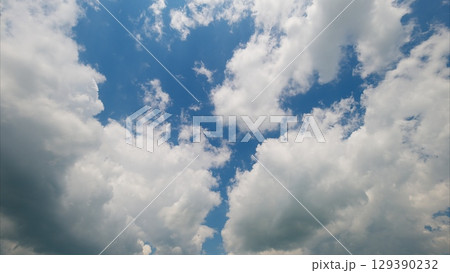 Natural cumulus fluffy white clouds on the background of a blue clear sky with an empty copy space. Blank template for text, advertise, artwork. Nature atmosphere environment on sunny day