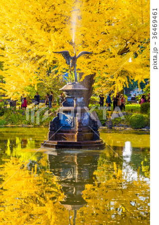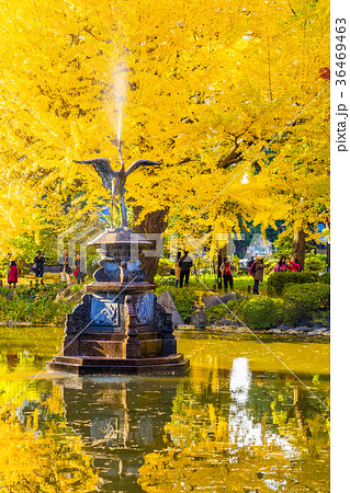 秋の東京 紅葉の日比谷公園 鶴の噴水と雲形池