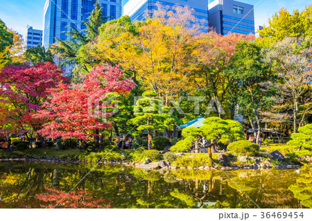 日比谷公園雲形池紅葉と霞が関高層ビル
