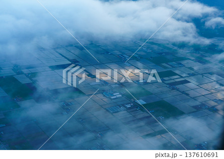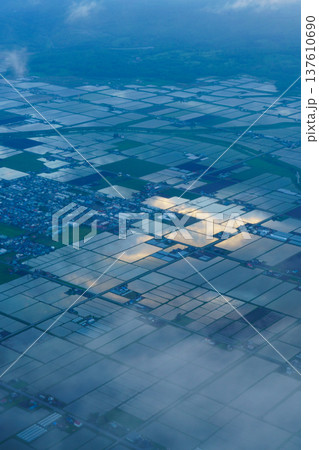飛行機から見た初夏の水田が広がる田園風景