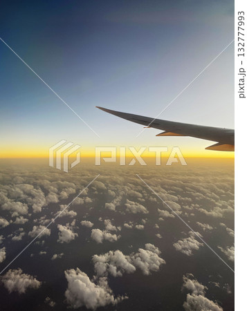 飛行機の窓から眺めた夕焼けの空と雲、水平線に広がる幻想的な景色