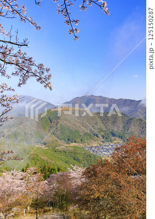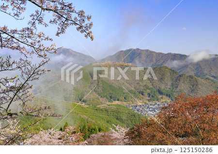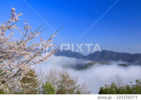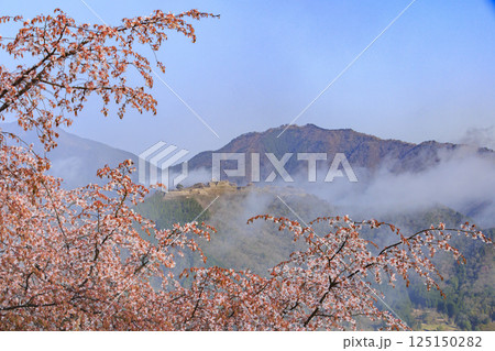 桜満開に咲く立雲峡から望む雲海の中の竹田城跡