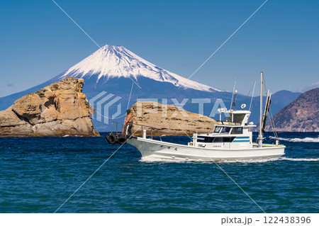 伊豆 雲見の夫婦岩と富士山 白い船