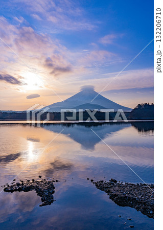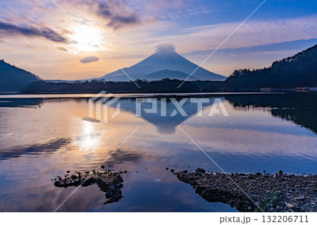 山中湖 富士五湖 山梨 日本 日の出 湖 自然 富士山 俯瞰 風景 雲 晴れ 絶景