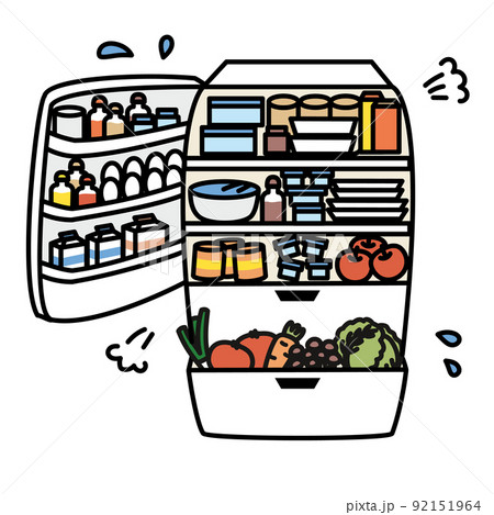 満タンに詰め込まれた冷蔵を見て試案している女性と冷蔵庫と女性 セット イラスト素材