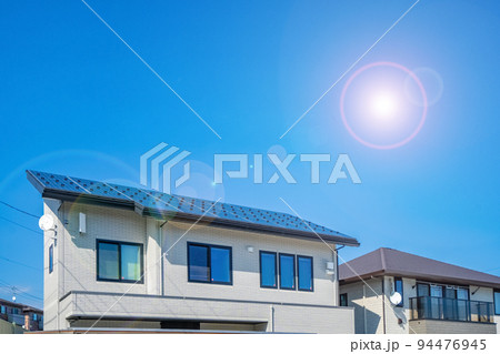 晴天の直射日光を浴び眩しく反射する太陽光パネル発電システム屋根設置ECOエネルギー電力自由化イメージ