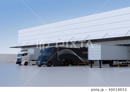 物流センタートラックターミナルの前にある電動トラックのクレイシェーディングイメージ