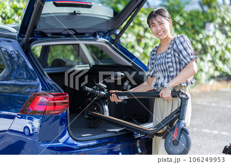旅行先の駐車場で電動キックボードを車のトランクに収納する若くて可愛い女性