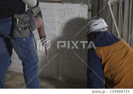 電動ハツリ機でタイルを剥がそうとする作業員男性