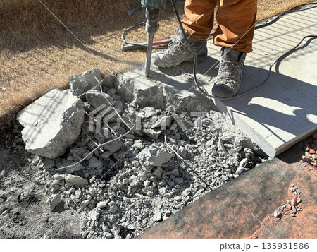 電動ハンマ(ジャンクハンマー)でコンクリートを割る土木作用員