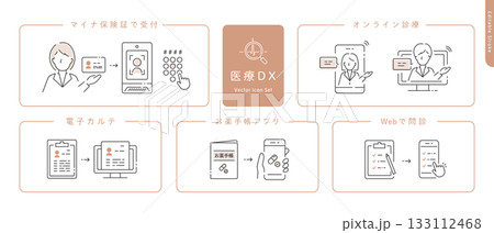 医療DXのベクターアイコンセット オンライン診療・電子カルテ・マイナ保険証・Web問診・お薬手帳