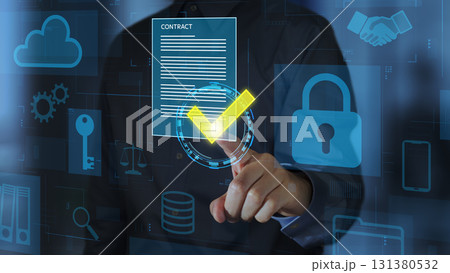 契約書へのデジタル署名。暗号化と認証技術を用いた文書への電子署名。ファイルアイコンをタップするビジネ
