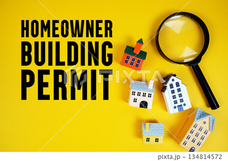 Homeowner Building Permit text with house models and magnifying glass on yellow background