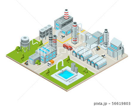 Industrial factory buildings set. Industrial buildings with pipes, power station, thermal nuclear power plants, different manufacturing plant, warehouse, factory with storage tanks for oil, gas