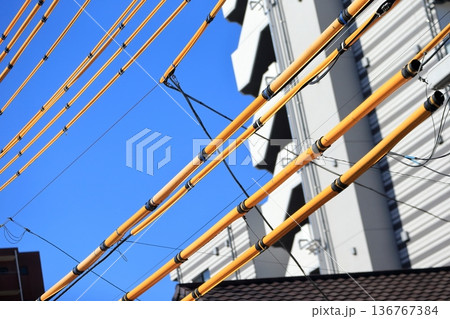 工事現場周辺の電線防護カバーと快晴の青空 a-2 高彩度