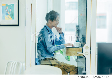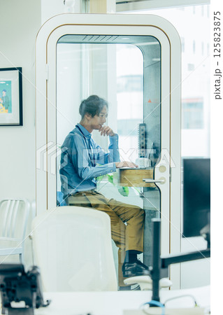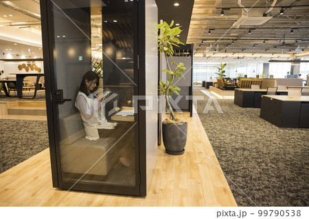 デザインオフィスの個室ブースでスマホを操作する若い女性