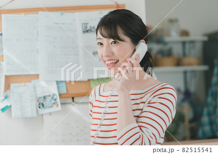 固定電話右で電話笑顔大人女性