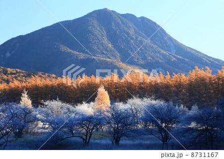 霧氷の付いた唐松に朝日差す奥日光小田代ヶ原