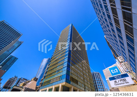 日本の東京都市景観「虎ノ門」の交差点から虎ノ門駅やビル群などを望む