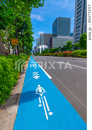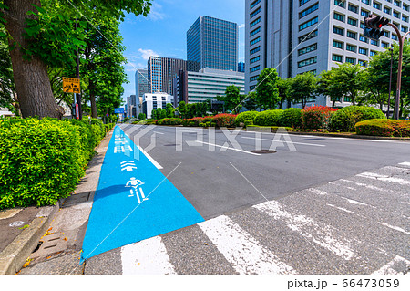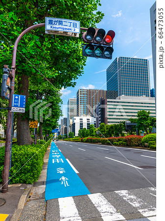日本の東京都市景観 霞が関の官庁街。自転車専用通行帯などを望む