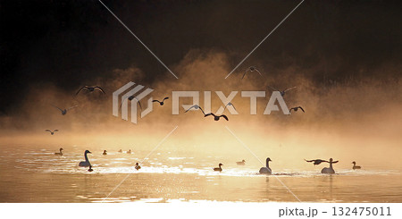 朝霧で霞む中を飛び来る鴨の群れ、幻想的、エコロジーイメージ
