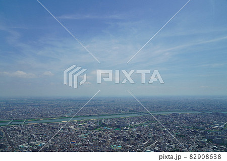 猛暑日の遠くが霞んでいる東京スカイツリーからの眺め