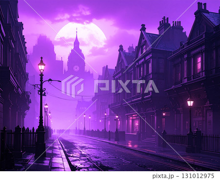 紫の月夜に浮かぶレトロな街並みが霧に包まれ幻想的な風景