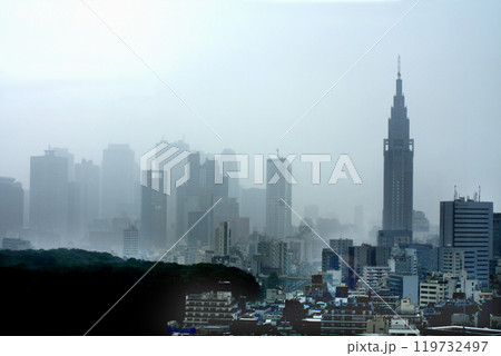 原宿のビルから見渡した新宿方面の高層ビル群は霧に包まれ、幻想的で消え行きそうな風景に