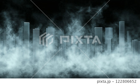 Mysterious cityscape with foggy night atmosphere and towering skyscrapers