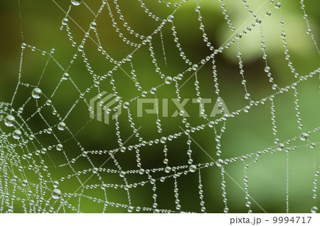 Beautiful natural background with a necklace of water drops on a cobweb in the grass in spring summer. The texture of the dew drops on the web in nature macro macro with soft focus.