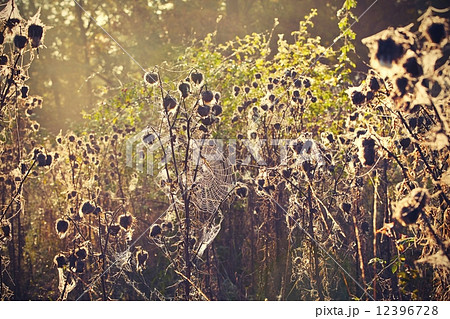 Cobweb on blurred grass background. Morning dew on cobweb. Foggy morning.