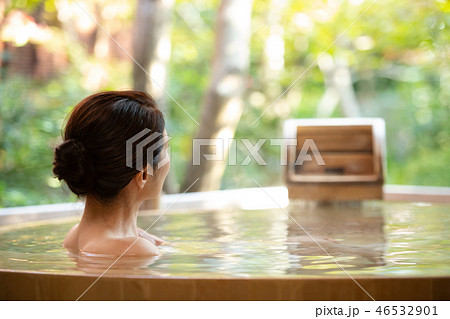 温泉 露天風呂 入浴 ミドル女性 旅行イメージ