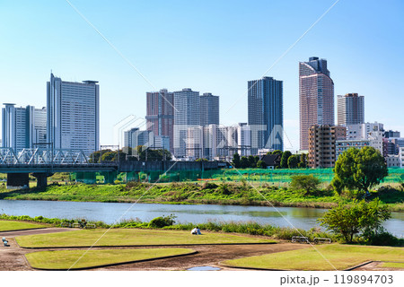 川崎市 武蔵小杉のタワーマンション群と新幹線の風景