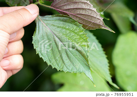 交雑種のシソ 葉を裏返す 男性の手 (9月) 家庭菜園