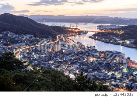 尾道・千光寺からしまなみ海道と曲線を描く山陽本線を望む(長秒露光)