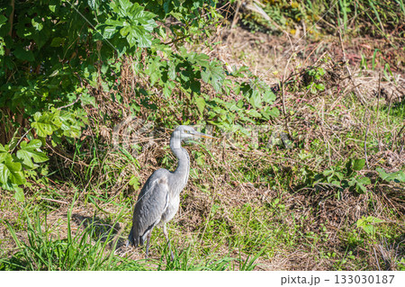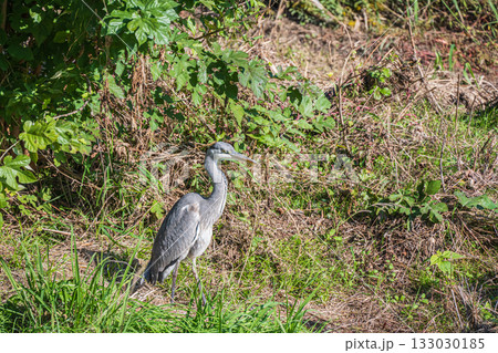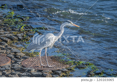 土佐堀川の川岸に佇むアオサギ 大阪市中之島公園