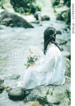 白いワンピースで夏の川に座る女性の後ろ姿