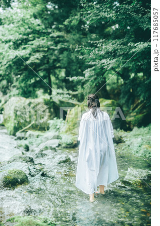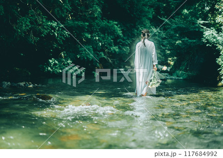 白いワンピースで夏の川に入っている女性の後ろ姿