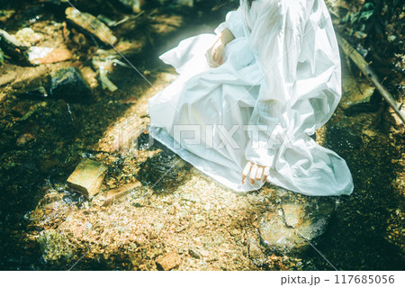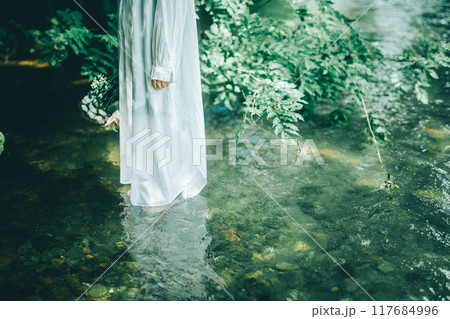 白いワンピースで夏の川に入っている女性の手元と足元