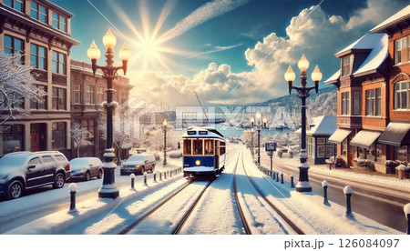 八幡坂より函館港を望む ハイカラ電車と雪景色