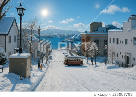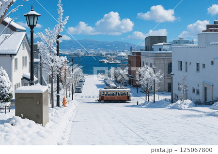 八幡坂より函館港を望む ハイカラ電車と雪景色