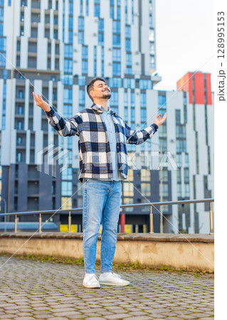 Mature man tourist with arms outstretched meditating with closed eyes standing on downtown street