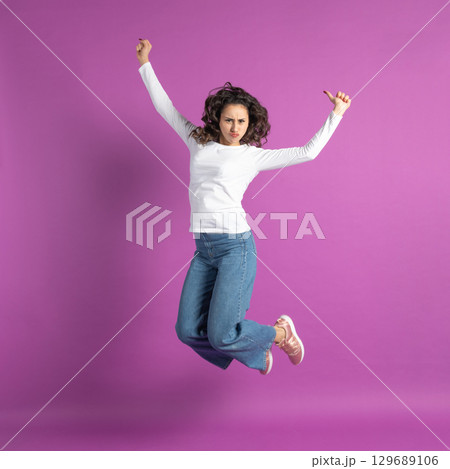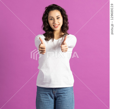 Beautiful blonde woman with big wavy hair and pink make-up studio portrait