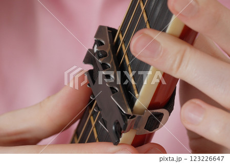 Female fingers attaches capotasto to Spanish six string acoustic guitar. Selective focus, handheld