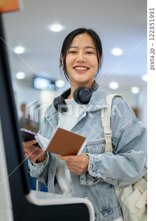 A smiling Asian female passenger stands in front of an airport self-check-in kiosk in the airport.