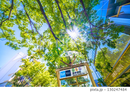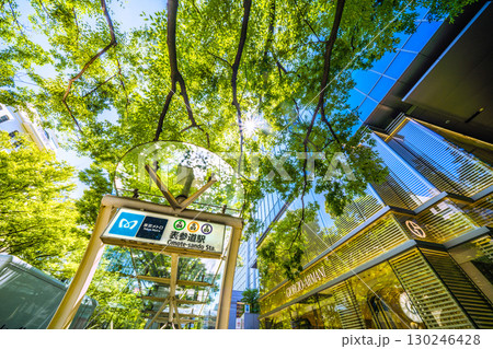 日本の東京都市景観 東京・表参道の緑溢れる並木や表参道交差点前の東京メトロ 表参道駅などを望む