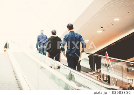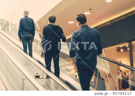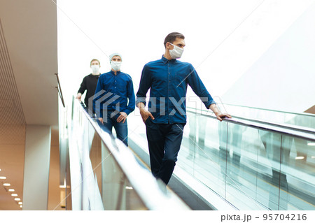people standing on the escalator steps at a safe distance
