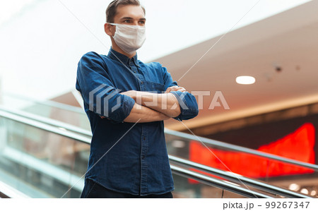 man in a protective mask standing on the steps of the subway escalator.
