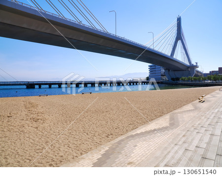 青森ベイブリッジと青森ラブリッジが見える、あおもり駅前ビーチの風景